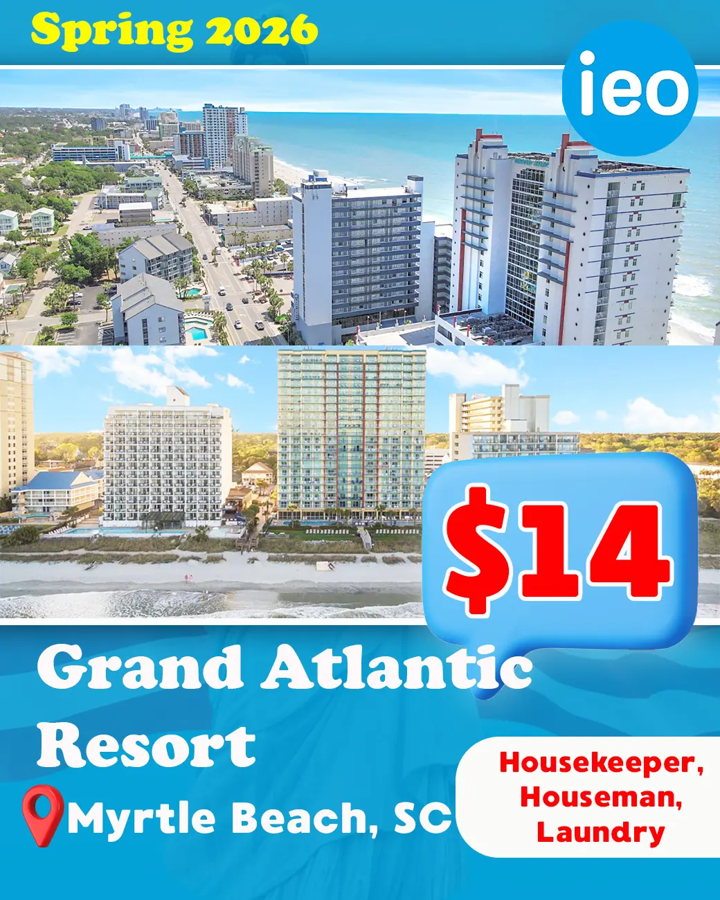 Housekeeper, Houseman, Laundry : Female applicants will do housekeeping: Cleaning rooms, vacuuming, dusting, cleaning bathrooms, changing towels/sheets, and doing laundry, taking out trash, cleaning public areas of the property. Grounds: picking up trash in the parking lot and around the pool. All are required to do constant bending, kneeling, and lifting (up to 10 kilos) each day throughout the day. You must be able to speak and understand English at a level of 7 or higher on the ESOL scale. Laundry: you will be responsible for doing and folding all the laundry for the resort. Houseman: will assist and supervise housekeepers and ensure all common areas are clean in the hotel.