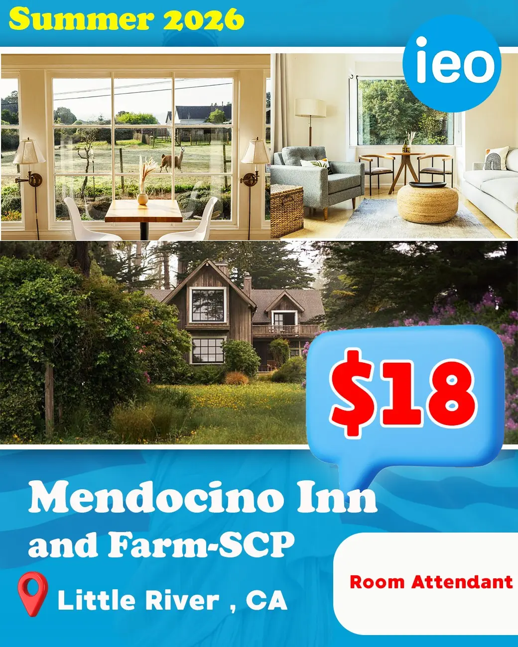 **Participants will live in a room at SCP Mendocino Inn & Farm or a room at SCP Mendocino Coastal Lodge. Housing will be determined by the host employer upon arrival. Participants will share a double occupancy room with 2 beds and 1 bathroom. Each room has a microwave, mini-refrigerator, and television. There is no traditional stovetop available.