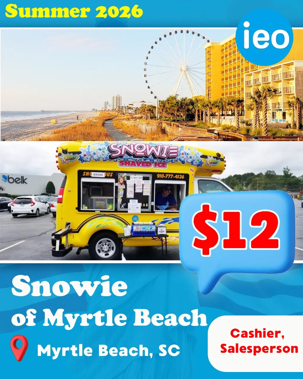 Kiosk Attendant : Job Duties include, but are not limited to: Preparing a variety of drinks and treats for customers, including fresh-squeezed lemonade, smoothies, coffee drinks, frappuccinos, popcorn, and flavored cotton candy. Providing cheerful, outgoing customer service—greeting customers, taking orders, and ensuring every drink or treat is served with pride. Handling all transactions accurately and assisting with daily cash-out procedures. Stocking kiosks with necessary supplies and transporting items (via carts or dollies) to other Snowie’s kiosks/stores within the Broadway at the Beach complex. Working at different kiosks as assigned by the manager based on staffing needs. Assisting with light cleaning to maintain a safe and welcoming environment. Ideal Candidate: Cheerful, outgoing, and energetic! You enjoy interacting with customers, working as part of a team, and taking pride in creating fun treats that brighten people’s day.