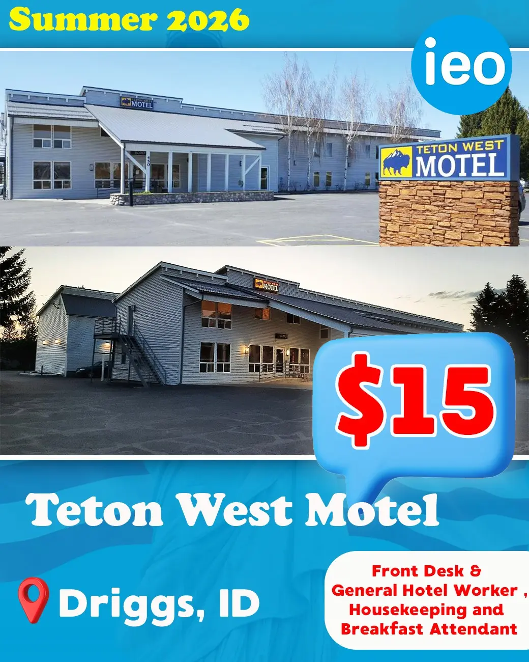 ** Employer has three different apartments where participants may live. Two are located on-site at Teton West Motel, and both have 3 bedrooms and 3 bathrooms. Each bedroom will have a set of bunk beds and will accommodate 2 participants. There will be up to 6 people living in each apartment. Bedrooms will be gender specific, but males and females may share the common areas. The 3rd apartment is located less than 1 mile (1.6 kilometers) down the road at the Super 8 hotel. This apartment has 1 bedroom and 1 bathroom, and there will be up to 3 participants in the bedroom and sharing the apartment. All apartments have full kitchen and common areas, and utility and internet costs are included in the price of rent. Coin-operated laundry is available on-site at both locations. Housing is located in a rural area with limited nightlife.