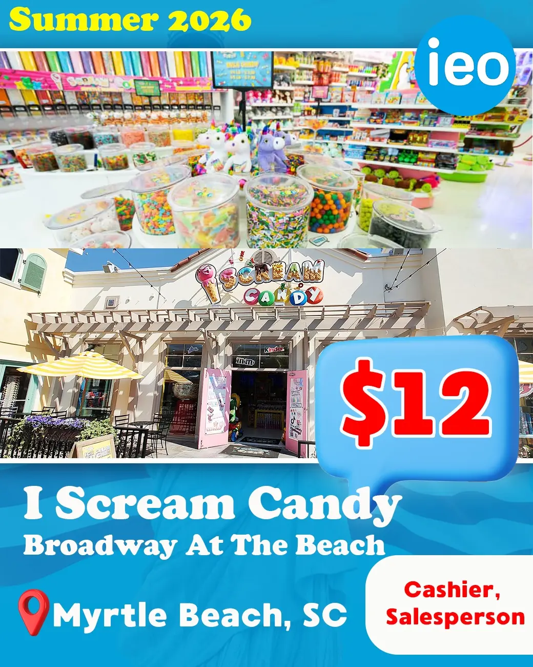 Cashier/Salesperson : Candy and ice cream shop sales associate; assist customers, prepare treats, cashier duties.